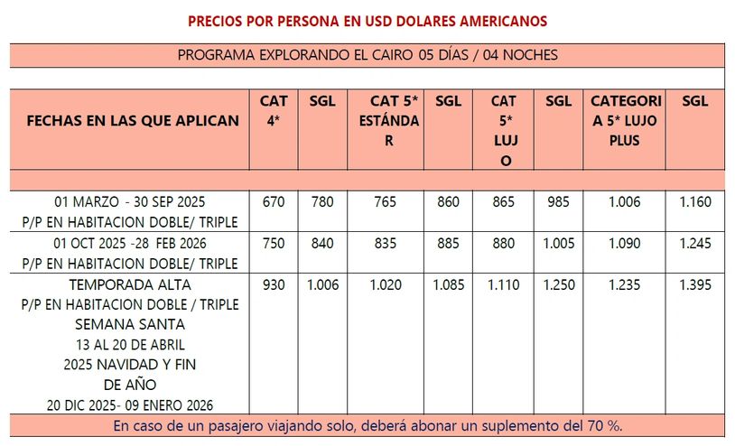 Desayuno. Día libre, con opción de tour de día completo por El Cairo. Incluye Museo de Arte Faraónico (tesoro de Tutankamón), almuerzo, Ciudadela de Saladino, Mezquita de Mohamed Alí, Iglesia de San Sergio y Mercado de Khan el Khalili. Regreso al hotel. Noche opcional: cena buffet con espectáculo en barco por el Nilo. Alojamiento.